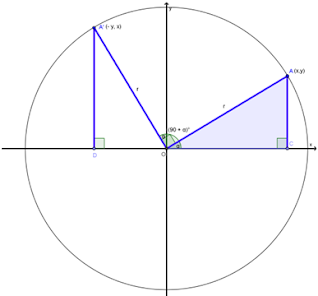 Jika diputar dengan pusat perputaran adalah O(0,0) sejauh 90° dengan arah berlawanan dengan arah putar jarum jam, maka bayangan titik A oleh perputaran tersebut adalah A'(- y , x ). Dengan demikian, 'AOA' = (90° + ) dan OA = OA' = r .
