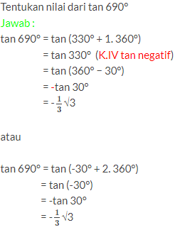 Jika sudut A lebih besar dari 360°, maka sudut A harus diubah terlebih dahulu sehingga berbentuk (θ + k .360°) dengan k = 1, 2, 3, 4. Dengan demikian: